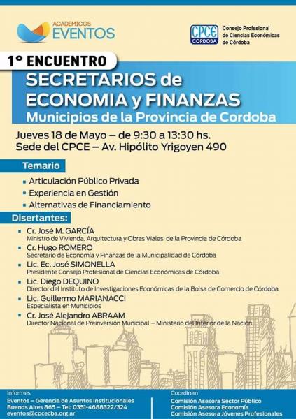 16/05/2017 - GILLI PARTICIPARÁ DEL 1º ENCUENTRO DE SECRETARIOS DE ECONOMÍA Y FINANZAS Organizado por el Consejo de Ciencias Económicas de la Provincia de Córdoba, este jueves 18 se realizará el 1º Encuentro de Secretarios de Economía y Finanzas de Municipios de la Provincia de Córdoba. El encuentro se desarrollará en la sede de la institución, sita en Av. Hipólito Yrigoyen 490 y contará con la participación de más de 30 funcionarios públicos, entre los que se encuentra el Secretario de Economía y Finanzas de la Municipalidad de Villa Carlos Paz, Héctor Daniel Gilli. En este sentido, el temario a desarrollar será: articulación público-privada, experiencia en gestión, y alternativas de financiamiento. Para mayor información, los interesados podrán enviar un correo electrónico a eventos@cpcecba.org.ar |