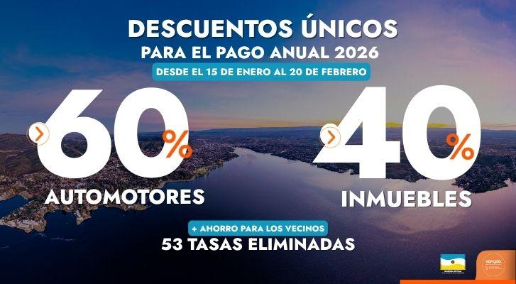 30/12/2025 - ACCEDÉ A DESCUENTOS ÚNICOS EN LAS TASAS CON EL PAGO ANUAL DEL 2026: 60% de descuento en automotores y 40 % de descuento en inmuebles: