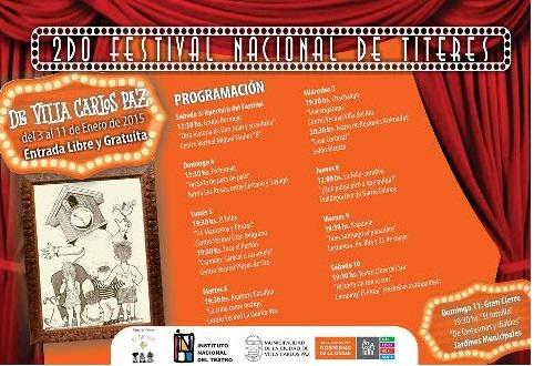 07/01/2015 - 2º FESTIVAL NACIONAL DE TITERES En el marco del programa “Verano en tu Barrio”, el Gobierno de la Ciudad invita a participar del 2º Festival Nacional de Títeres de Villa Carlos Paz organizado conjuntamente por el Instituto Nacional del Teatro, Teatro de Títeres El Lucero, la Dirección de Cultura, Casa de la Juventud y la Coordinación de Políticas Vecinales. El mismo se desarrollará hasta el 11 de Enero en diferentes centros vecinales, una fecha en la costanera (Av. Illia, frente a Junior B) y por último el día domingo 11 a las 19:30 hs se realizará el cierre del Festival en los Jardines Municipales. Invitamos a todos los niños, jóvenes y adultos a apoyar las nuevas y viejas alternativas artísticas que favorecen a la participación e inclusión de todos los vecinos y turistas. El programa de presentaciones es el siguiente: Miércoles 7: Jueves 8: Viernes 9: CIERRE DEL FESTIVAL: |
