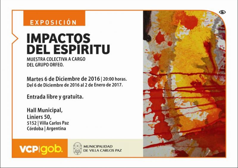 05/12/2016 - INAUGURAN EXPOSICIÓN EN EL HALL MUNICIPAL “Impactos del espíritu” se denomina la muestra colectiva a cargo del Grupo Orfeo que se inaugurará este martes 6 de diciembre a las 20:00 h en el Hall del Palacio Municipal (Liniers 50). La misma podrá visitarse hasta el lunes 2 de enero de 2017, con entrada libre y gratuita. Invitamos a los interesados a formar parte de esta actividad cultural organizada por el Gobierno de la Ciudad. |