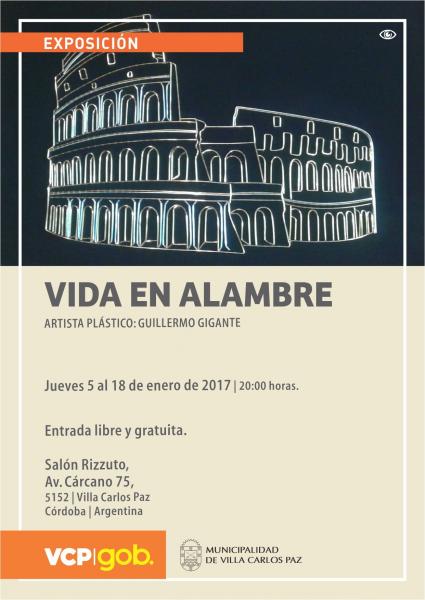 04/01/2017 - INAUGURAN EXPOSICIÓN EN EL SALÓN RIZZUTO “Vida en alambre” se denomina la muestra del artista plástico Guillermo Gigante que se inaugurará este jueves 5 de enero a las 20:00 h en el Salón Rizzuto (Av. Cárcano 75). La misma podrá visitarse hasta el miércoles 18 de enero de 2017, con entrada libre y gratuita. Invitamos a los interesados a formar parte de esta actividad cultural organizada por el Gobierno de la Ciudad. |