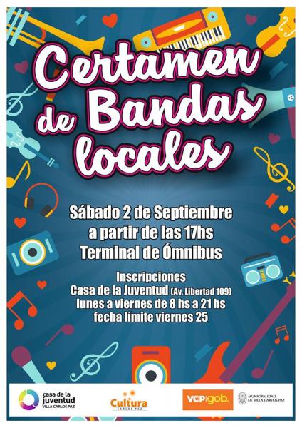 23/08/2017 - CERTAMEN DE BANDAS LOCALES EN CARLOS PAZ El Gobierno de la Ciudad a través de la Dirección de Cultura y la Casa de la Juventud invita a las bandas de música de Villa Carlos Paz a participar del "Certamen de Bandas Locales" para seleccionar a los grupos que participarán en los festejos de la Fiesta de la Primavera 2017. El evento se llevará a cabo el próximo sábado 2 de septiembre de 17 a 21 hs. en los Jardines de la Terminal de Ómnibus de la ciudad (Av. San Martín al 400). Las bandas interesadas en participar deberán presentarse personalmente en la Casa de la Juventud (Av. Libertad 109) hasta el viernes 25 de agosto en el horario de 8 a 21 hs. y presentar en un sobre cerrado lo siguiente: