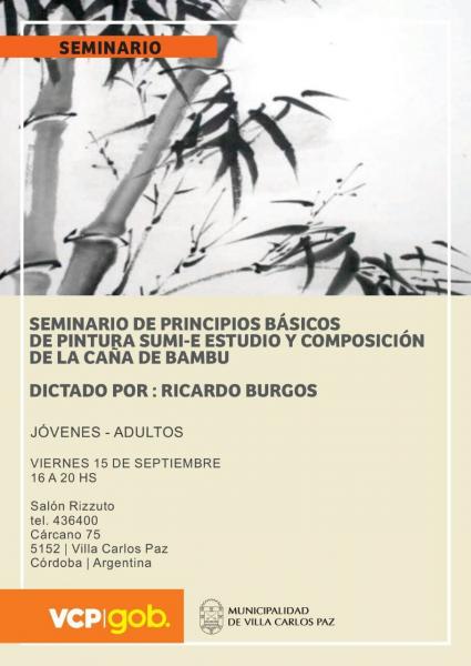 El Gobierno de la Ciudad a través de la Dirección de Cultura invita a los interesados a participar del seminario “Principios básicos de pintura Sumi-e, estudio y composición de la caña de bambú” a realizarse el viernes 15 de septiembre en el Salón Rizzuto. Destinado a jóvenes y adultos, estará a cargo del profesor Ricardo Burgos y se realizará de 16:00 a 20:00 hs. Para mayor información dirigirse al Salón Rizzuto (Av. Cárcano 75), comunicarse al tel. 436400 (de lunes a viernes de 08:00 a 21:00 hs.) o al mail culturavillacarlospaz@hotmail.com. |