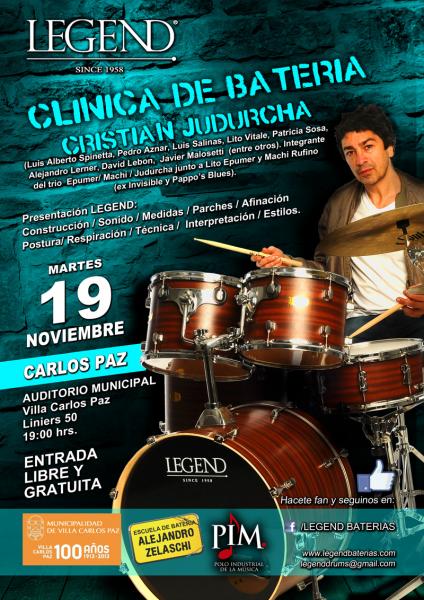 19/11/2013 - CLINICA GRATUITA DE BATERÍA DE CRISTIAN JUDURCHA Con entrada libre y gratuita y la coordinación del Centro de Educación Musical, hoy martes 19 de noviembre a las 19 hs. se llevará a cabo en el Auditorio Municipal una clínica de batería a cargo de Cristian Judurcha, reconocido músico de artistas como Spinetta, Aznar, Luis Salinas, Lito Vitale, Alejandro Lerner, entre otros. Algunos de los temas que se desarrollarán serán construcción, sonido, medidas, parches, afinación, postura, respiración, técnica, interpretación y estilos. |