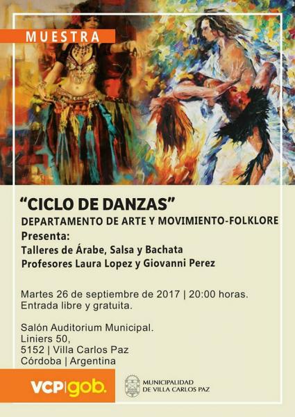 25/09/2017 - CICLO DE DANZAS EN EL AUDITORIO MUNICIPAL El Gobierno de la Ciudad a través de la Dirección de Cultura invita a los vecinos al “Ciclo de Danzas” donde el Departamento de Arte y Movimiento- Folklore presentará los talleres de árabe, salsa y bachata a cargo de los profesores Laura Lopez y Giovanni Pérez. La muestra tendrá lugar este martes 26 de septiembre a las 20:00 hs. en el Auditorio Municipal, con entrada libre y gratuita. |