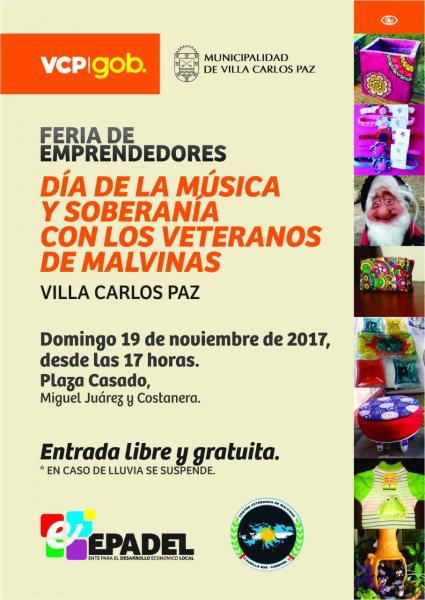14/11/2017 - FESTIVAL ARTÍSTICO Y FERIA DE EMPRENDEDORES El Gobierno de la Ciudad a través de EPADEL y la Dirección de Cultura junto a los Veteranos de Malvinas, invitan a vecinos y turistas al Festival Artístico y Feria de Emprendedores a realizarse en Plaza Casado el próximo domingo 19 de noviembre de 17 a 23 horas. El evento es con entrada libre y gratuita, y contará con la participación de artistas locales y más de 25 puestos de productos autorizados (alimenticios, reciclados, artesanales, artísticos, etc.) de elaboración local. Se suspende en caso de lluvia. |