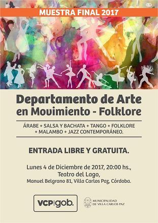 01/12/2017 - MUESTRA FINAL DEL DEPARTAMENTO DE ARTE EN MOVIMIENTO-FOLKLORE El Gobierno de la Ciudad a través de la Dirección de Cultura, invita a los interesados a participar el lunes 4 de diciembre de la muestra final del Departamento de Arte en Movimiento-Folklore en la cual participarán los talleres de árabe, salsa y bachata, tango, folklore, malambo y jazz contemporáneo. Tendrá lugar a las 20:00 hs. en el Teatro del Lago (Belgrano 81). La entrada es libre y gratuita. |