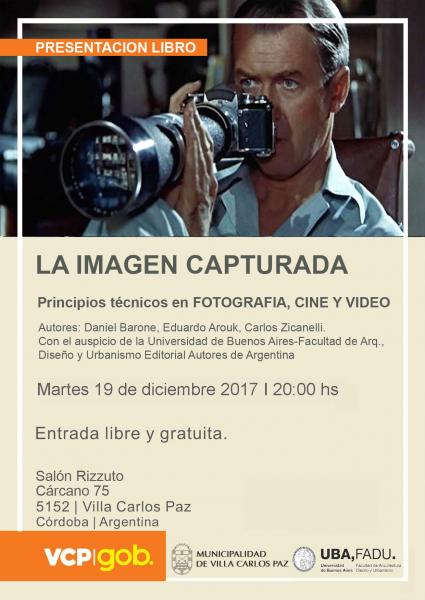 El Gobierno de la Ciudad a través de la Dirección de Cultura invita a los interesados a participar de la presentación del libro “La imagen capturada”, principios técnicos en fotografía, cine y video de los autores Daniel Barone, Eduardo Arouk y Carlos Zicanelli. Tendrá lugar este martes 19 de diciembre a las 20:00 hs. en el Salón Rizzuto (Av. Cárcano 75).
