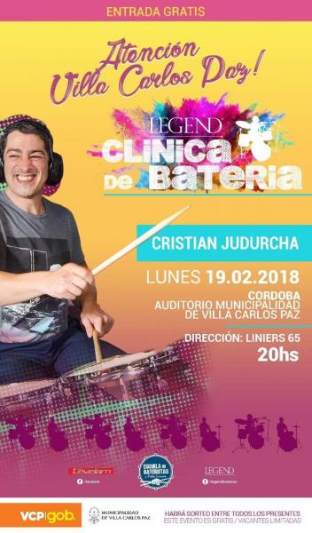 15/02/2018 - CLÍNICA DE BATERÍA CON CRISTIAN JUDURCHA El Gobierno de la Ciudad a través del la Dirección de Cultura invita a músicos y al público en general a participar de la Clínica de Batería que se realizará el lunes 19 de febrero a las 20:00 hs. en el Auditorio Municipal (Liniers 50). El reconocido baterista Cristian Judurcha brindará una charla junto a cuatro músicos con entrada libre y gratuita. Para mayor información comunicarse al 436402 (CEM). |