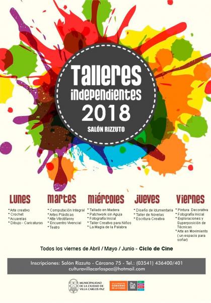 28/02/2018 - INSCRIPCIONES ABIERTAS PARA LOS TALLERES INDEPENDIENTES El Gobierno de la Ciudad a través de la Dirección de Cultura informa que se encuentran abiertas las inscripciones al ciclo lectivo 2018 de los talleres independientes en el Salón Rizzuto. Los mismos están destinados a niños, jóvenes y adultos y contarán con turnos por la mañana y la tarde. Cronograma: Lunes: -Arte creativo -Crochet -Acuarelas -Dibujo/ caricaturas Martes: -Computación integral - Artes plásticas -Atte Vitrotifanny - Encuentro Vivencial -Teatro Miércoles: -Tallado de madera -Patchwork sin aguja -Taller creativo para niños -Fotografía inicial -La magia de la palabra Jueves: -Diseño de indumentaria -Taller de novelas -Escritura creativa Viernes: -Pintura decorativa - Fotografía inicial - Exploraciones y superposición de técnicas. -Arte en movimiento (un espacio para soñar). Consultas en el Salón Rizzuto (Cárcano 75) de lunes a viernes de 8:00 a 21:00 hs. Tel. 436400/01 o al mail culturavillacarlospaz@hotmail.com