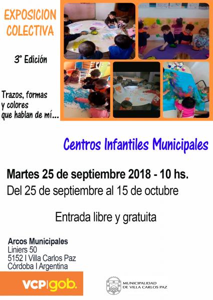 19/09/2018 - INAUGURA LA EXPOSICIÓN COLECTIVA DE LOS CENTROS INFANTILES MUNICIPALES El Municipio a través de la Dirección de Cultura y la Dirección de Desarrollo Social y Educación invita a los interesados a participar de la inauguración de la exposición colectiva de los Centros Infantiles Municipales 3° edición, denominada “Trazos, formas y colores que hablan de mí”. La misma tendrá lugar el martes 25 de septiembre a las 10 hs. en los Arcos Municipales (Liniers 50) con entrada libre y gratuita. |