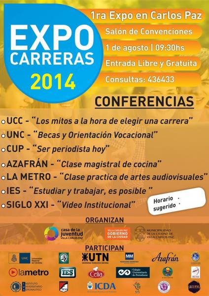 15/07/2014 - EXPO CARRERAS 2014 Organizada por la Casa de la Juventud del Gobierno de la Ciudad, el próximo viernes 1º de agosto desde las 9:30 hs. en la Sala de Convenciones, Villa Carlos Paz tendrá su “Expo Carreras 2014” con la participación de 18 instituciones de nivel superior. El objetivo de esta exposición es que los estudiantes de Carlos Paz no tengan que viajar a la ciudad de Córdoba para conocer la oferta académica de las instituciones que tendrán sus stands y realizarán conferencias con temáticas específicas. La entrada es libre y gratuita. |