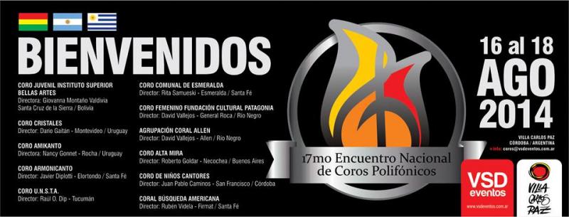 07/08/2014 - 7º ENCUENTRO NACIONAL DE COROS Villa Carlos Paz será sede del sábado 16 al lunes 18 de agosto del 7º Encuentro Nacional de Coros organizado por Meeting eventos con el apoyo del Gobierno de la Ciudad. El programa de presentaciones será el siguiente: Domingo 17 Lunes 18 CORO CRISTALES CORO AMIKANTO CORO ARMONICANTO CORO COMUNAL DE ESMERALDA CORO FEMENINO FUNDACIÓN CULTURAL PATAGONIA AGRUPACION CORAL ALLEN CORO ALTA MIRA CORO DE NIÑOS CANTORES CORAL BÚSQUEDA AMERICANA Invitamos a los vecinos a participar de los conciertos brindados por los grupos participantes. La entrada es libre y gratuita. |
