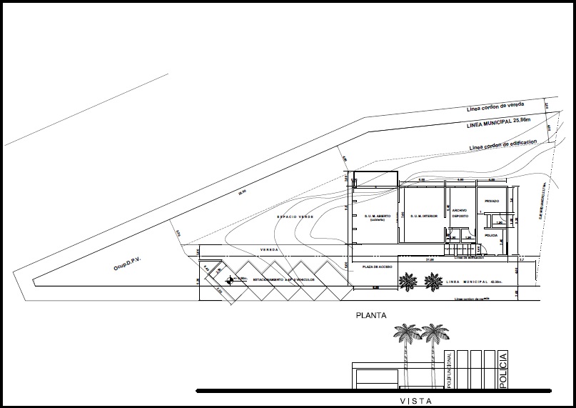 La topografía del terreno, las proporciones del espacio, el código de edificación y la ocupación con construcción del vecino lote 18 condicionan considerablemente al emplazamiento de la obra, dando como resultado una área limitada sobre la cual se proyectara el edificio para los requerimientos barriales de oficina policial y centro vecinal para actividades comunales: POLIFUNCIONAL COSTA AZUL