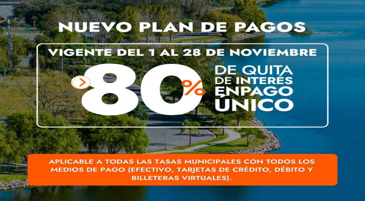 Abonando las tasas adeudadas antes del 28 de noviembre los contribuyentes obtendrán una quita del 80 % de interés y con la posibilidad de financiación de hasta 12 cuotas. Algunas de las tasas comprendidas que incluye el Plan son Inmuebles, Automotor, Obras Privadas, Agua y Cloacas, Industria y Comercio, Cementerio, etcétera (Ordenanza N° 7237).
