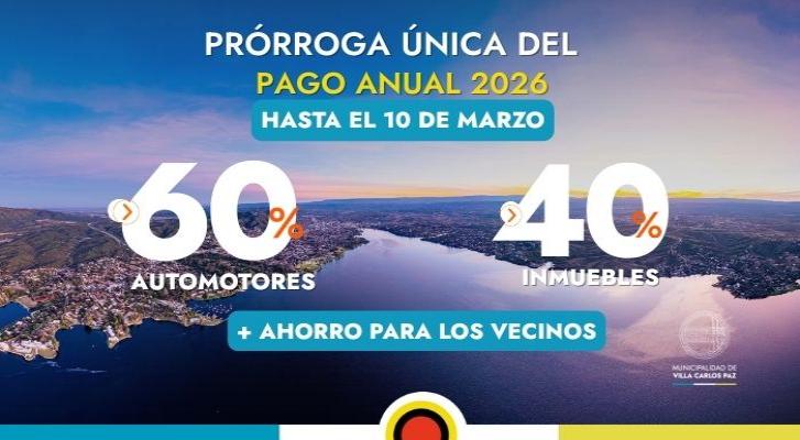 El Municipio de Villa Carlos Paz informa a los vecinos que quienes estén al día con las tasas municipales podrán acceder a los descuentos del pago único anual del 2026: 60 % de descuento para automotores (abonando desde el 15 de enero hasta el 20 de febrero) y 40% descuento para inmuebles (abonando desde el 15 de enero hasta el 20 de febrero).